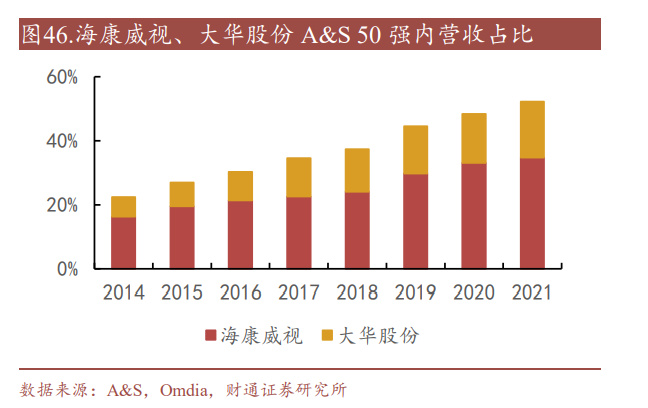 中国大陆入围榜单的企业数量逐年增多,龙头厂商地位稳固。根据 2022 年 11 月 A&S 发布的《全球安防 50 强企业》排行榜单,海康威视、大华股份蝉联榜单第 一第二的位置继续领跑;宇视科技、天地伟业分别全球第六、第七维持不变;其 他入榜中国公司还有宇通光学、中控智慧、英飞拓、科达科技、锐明技术等。纵 观历年 A&S 50 强排名变化,中国大陆入围榜单的企业数量逐年增多,体现出我 国安防行业发展的强劲态势。 行业门槛逐年提高,中小企业难入局。龙头企业依托技术、资源和规模优势保持 业绩稳定增长,而中小企业在安防碎片化市场难以形成规模逐步出清,营收排名 波动剧烈。据《全球安防 50 强企业》排行榜,上榜 50 强安防企业 2021 年共实现 营业收入 290.9 亿美元,同比增长了 15.8%;50 强企业入围门槛为 1880 万美元, 同比上年提高了 435 万美元。以 A&S 营收口径计算,全球安防 CR4 由 2013 年的 32%提升至 2021 年 68%。其中,海康威视市占率约 34.71%,大华股份市占率约 17.53%,CR2 达到 52.2%,牢牢占据行业领先地位,规模及先发优势铸就高壁垒。