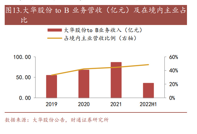企业业务有望超过政府业务,成为各公司着力发展的重点。2019-21 年海康威视 EBG 收入从 124.49 亿元增长至 166.29 亿元,2022 年受住宅、商业地产整体下行 影响,智慧建筑业务对 EBG 整体业绩有些拖累,但在能源冶金等其他行业的带动 下,整体 EBG 业务 2022H1 实现营收 68.31 亿元,同比+2.58%,维持增长,贡献 33.2%境内主业收入。2019-21 年大华股份 to B 业务收入从 54.65 亿元增长至 86.22 亿元;2022H1 实现 35.39 亿元,同比下降 1.59%,贡献 48.5%境内主业收入。