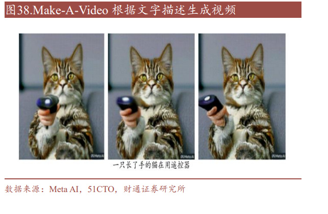 3) 提供高效的信息获取方式。谷歌于 2022 年 5 月推出由文本生成高清图像的模 型 Imagen,之后基于 Imagen 推出 DreamBooth 实现输入图片高度还原以及个 性化表达。META 于 2022 年 9 月 29 日首次推出一款 AI 系统模型:Make-AVideo,可以仅用几行文本生成视频。生成功能可以补足相关缺失的部分,比 如,用白天的相同场地场景生成夜晚的画面效果,优化监控效率。