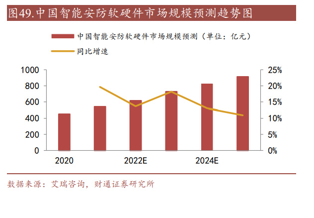 软硬协同智能升级,智能安防硬件市场高速成长。在大数据、人工智能等技术的 带动下,智能安防已经成为当前发展的主流趋势。根据 Juniper Research 的研究报 告,全球智能安防市场规模将从 2018 年的 120 亿美元增长到 2023 年的 450 亿美元,年复合高达 30.26%,增速远高于安防市场(-5.06%)。根据艾瑞咨询《2021 年 中国 Al+安防行业发展研究报告》,2020 年中国智能安防软硬件的市场规模达 453 亿元,市场规模增长速度达到 13.3%,预计 2025 年市场规模将增至 913 亿元。