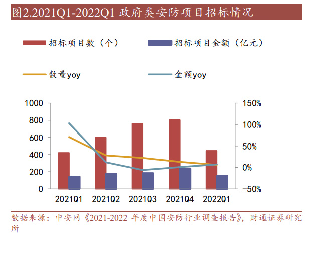 2021 年政府类安防市场稳定发展。受国家政策的不断推进、行业数字化转型等诸 多因素影响,安防行业整体市场稳定发展。根据《2021-2022 年度中国安防行业调 查报告》统计,2021 年全年政府类安防项目招标数量为 2613 个,同比+27%,招 标项目金额合计 748.9 亿元,同比+14%。2021 年全年政府类安防项目中标数量为 2650 个,同比+19%,中标项目金额合计 743.9 亿元,同比-4%。