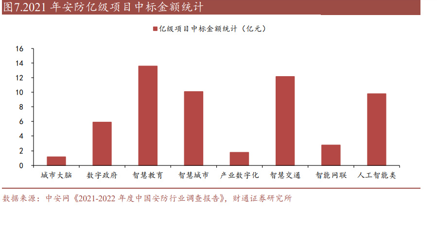 城市级大安防项目以教育、城市和交通类三大细分市场为主。在具体细分市场上, 政府类项目包含城市大脑、数字政府、智慧城市、智慧交通、智能网联、人工智 能类等,截止 2021 年末金额过亿项目超 20 个,累积中标金额约 65 亿元。 基于“安全、畅通、便民”理念涌现出众多值得开拓的新机会,2021 年智慧城市 相关项目(智慧城市、数字政府、城市大脑)中标金额 17.1 亿元,占比最大为 29.9%, 也是当前最主要发展的方向;智慧教育相关项目中标金额 13.6 亿元,占比 23.7%; 出行一直是城市建设的重点领域,智慧交通类(含智慧交通、交通大脑)中标金 额 12.1 亿元,占比 21.2%。