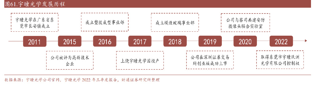 行业领先的光学解决方案提供商。公司 2011 年成立于东莞长安,2017 年上饶宇 瞳光学园投产,2019 年 9 月在深交所创业板上市,2020 年公司与蔡司开展战略合 作,共建安防摄像头联合实验室。2022 年公司取得玖洲光学控制权,进一步增强 车载领域实力。产品主要应用于公共安防监控设备、智能家居、车载摄像头、机 器视觉等高精密光学系统。2019-21年公司总营收从12.31亿元增长至20.62亿元; 2019-21 年公司归母净利润从 1.03 亿元增长至 2.43 亿元。