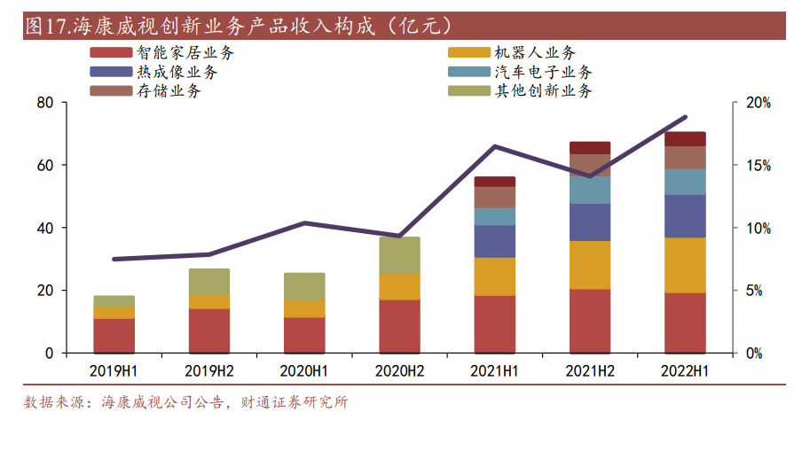 大华股份机器视觉/移动机器人、汽车电子、智能家居业务已经初具规模。2022H1, 大华股份创新业务实现收入 16.86 亿元,同比增长 40.84%,占总营收比重达 11.97%, 占比逐年提升。 其中,乐橙(智能家居)2022H1 实现了 50%以上的增速;华锐捷(汽车电子) 2022H1 实现了快速增长,未来会把传感作为一个主攻方向;华睿科技(机器视觉 /移动机器人)虽然上半年受到宏观经济、疫情、企业客户投资能力下降等因素影 响,但在汽车、屏显、锂电行业有较大突破,总体增速相较主业也有稳健的增长; 其他创新业务如智慧消防、智慧安检等还在孵化阶段。