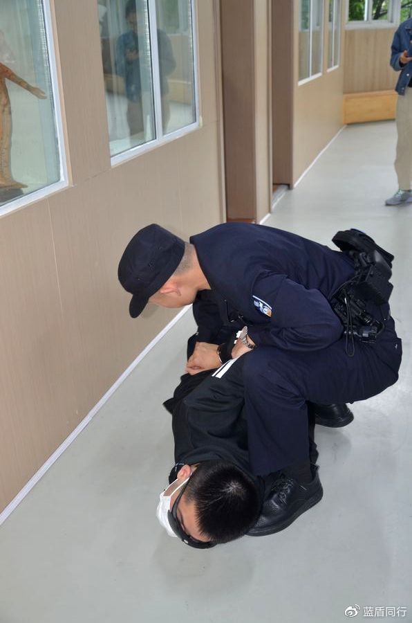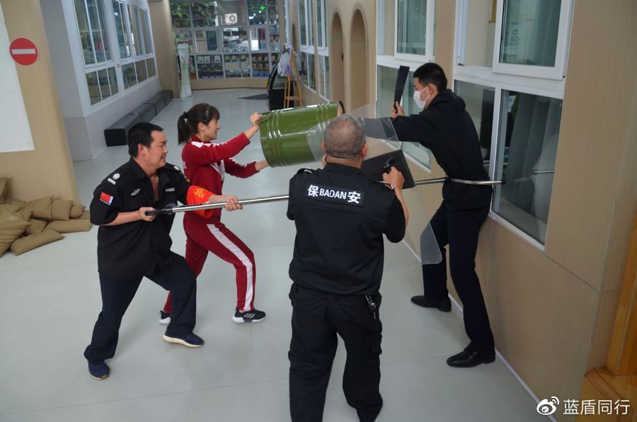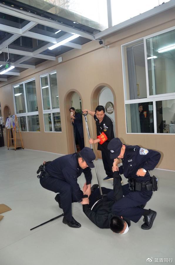 再次开始演练。本次配合较上次更为默契,“歹徒”虽然趁机闯入,却被保安及老师及时堵截,并利用钢叉、盾牌等及时将其困住。
