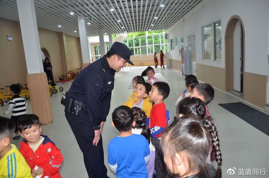 和蔼的警盾小哥哥们走进幼儿园,小朋友很好奇,围着他们问了好多问题。