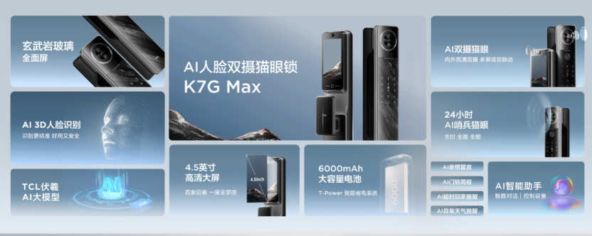 不仅是创新材料的应用,技术创新也是硬实力的体现, TCL智能锁今年发布了全球首款AI大模型-伏羲AI大模型,深度融合AI给到用户最极致的刷脸入户体验。凭借领先的AI技术,TCL AI人脸双摄猫眼锁K7G Max夺得“AI模型交互金奖”,这款产品搭载AI 3D人脸识别和AI双摄分布式猫眼。新一代AI 3D人脸识别,搭载8大AI自进化算法,使一次识别通过率提升1倍,即使在黑暗逆光或妆容变化的情况下,都能出色表现,大大提升了人脸解锁体验。AI双摄猫眼,搭载了内外双高清摄像头,家里家外状况都能看得见,全面升级AI系统,能够AI智能分析访客身份,AI生成访客视频,节省用户回看时间。还有AI亲情管家、AI智能助手、AI门锁简报、AI超时回家提醒功能,让智能锁更懂用户。
