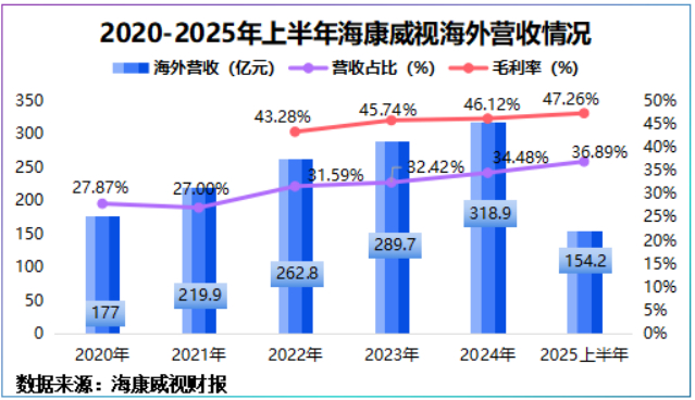 另一方面,公司海外毛利率也在显著改善:2022年公司海外毛利率为43.28%,2025年上半年该毛利率接近48%的水平线,成为海康威视新的利润洼地。