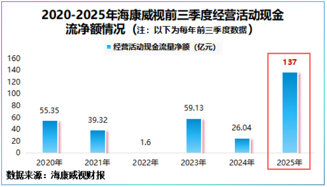 前三季度,海康威视实现净利润93.19亿元,同比跃升15%,经营活动现金流量净额同比劲增426.1%,达到137亿元,是净利润的1.47倍,盈利与成长双重狂欢。
