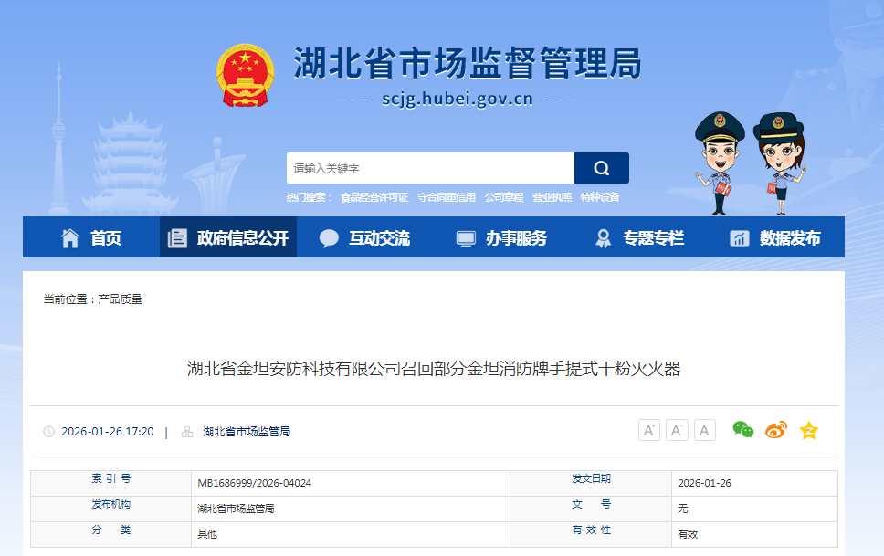 中国质量新闻网讯 据湖北省市场监管局网站消息,日前,湖北省金坦安防科技有限公司按照《消费品召回管理暂行规定》的要求,主动向湖北省市场监督管理局备案了召回计划,将自即日起,召回2025年7月11日至2025年8月14日期间制造的部分金坦消防牌手提式干粉灭火器(型号/规格:MF/ABCE1),涉及数量为2180具。